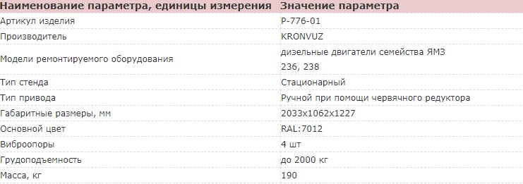 Характеристики стенда для сборки-разборки дизельных двигателей Р-776-01