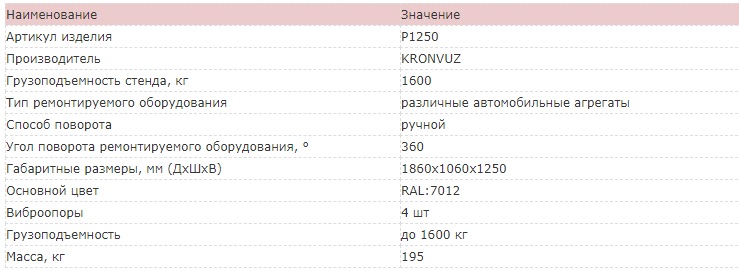 Стенд Р 1250 предназначен для сборки и разборки двигателей до и после проведениями над ними ремонтных работ. Он применяется на производстве, на станциях техобслуживания и в автомобильных мастерских. Устройство выдерживает вес двигателей до 1600 килограммов, таким образом, происходит обслуживание не только двигателей легковых автомобилей, но и небольших и средних грузовиков.